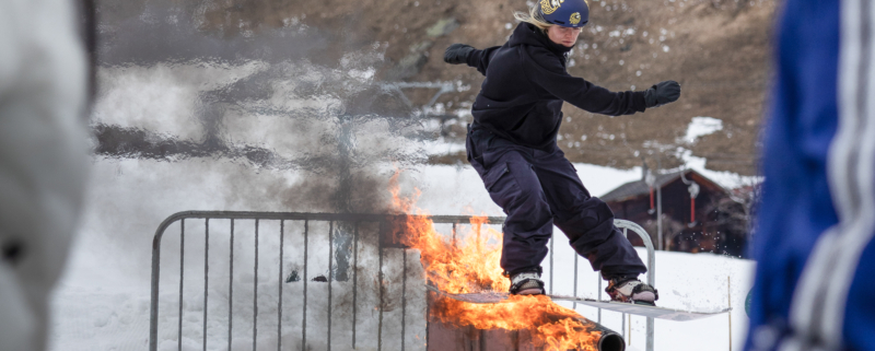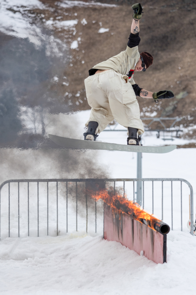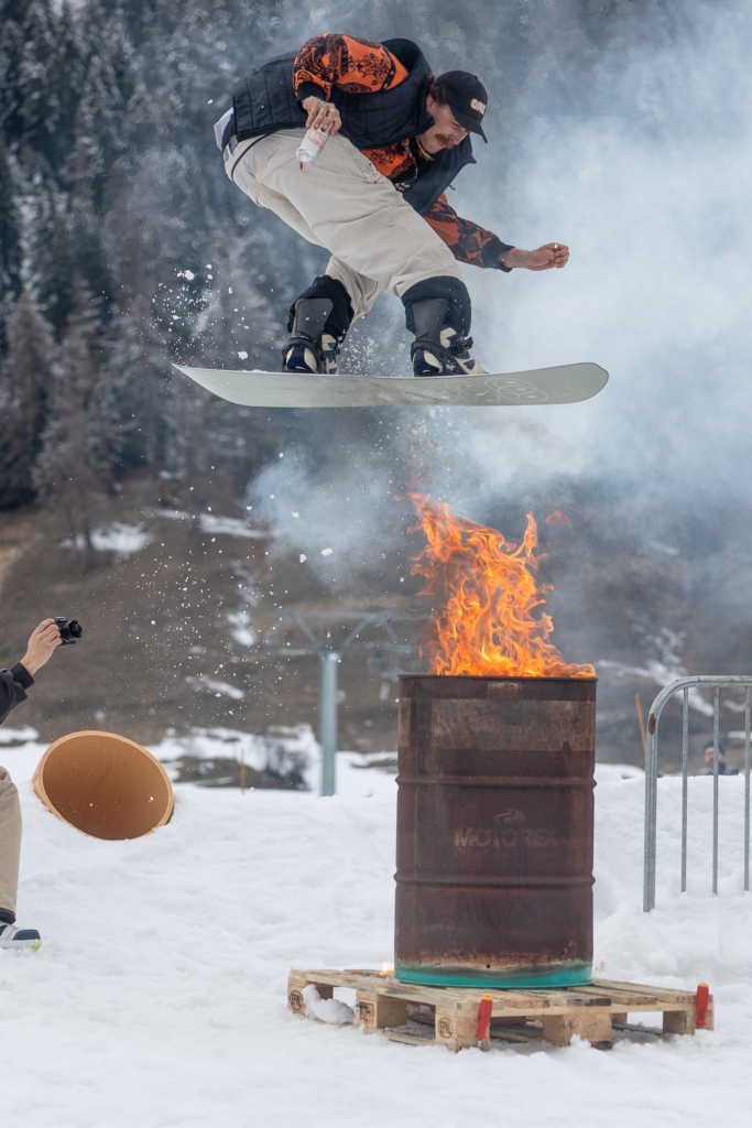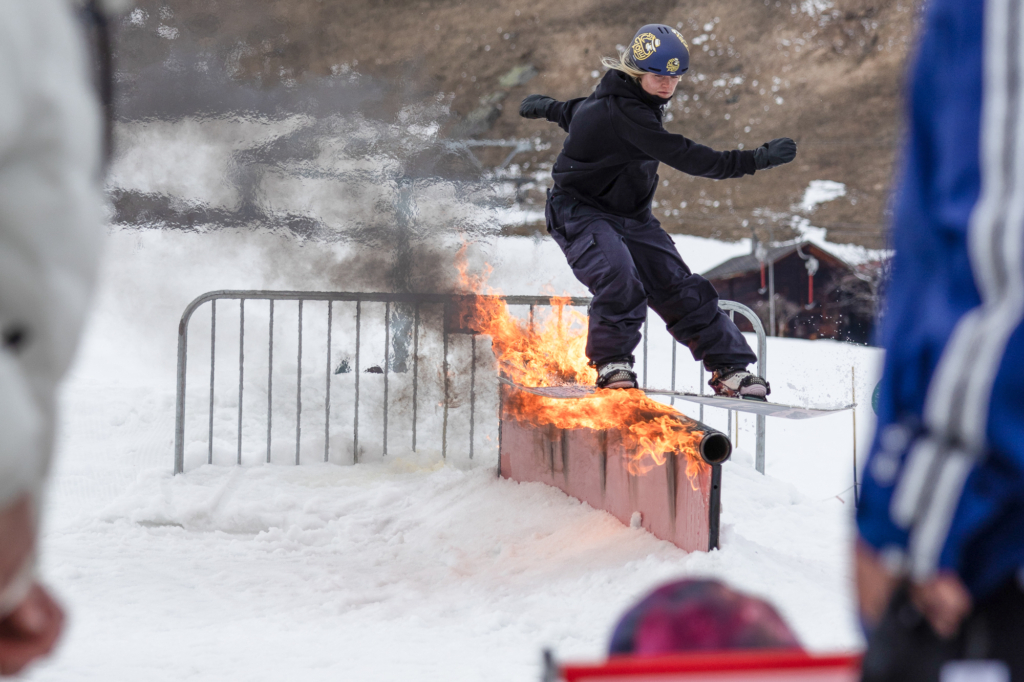 Around noon, the snow started to get slushy and approximately 50 riders started charging the features. Later in the afternoon 30 minut jam sessions were held on the three bottom features. More and more spectators showed up and cheered the riders on. The pyromaniacs did their best to ensure a good show, consistently lighiting things on fire. The atmosphere was electric after the three jam sessions and Juni motivated the riders for another spontaneous session by taking off of a pole jam and airing over a burning trash can – beer in hand.