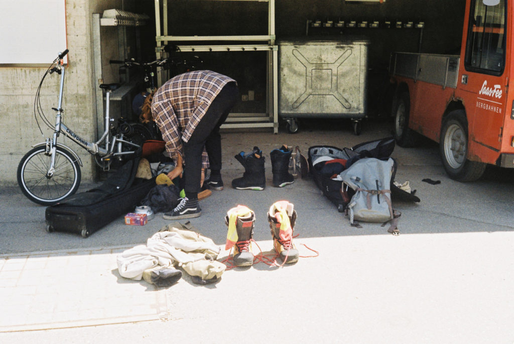 James Niederberger and Sevi Van Der Meer spent the weekend camping and cruising in Saas Fee. Considering that the glacier is practically in Levi Luggen’s backyard, it was only natural for him to join the fun. They documented their adventure in a series of analogue photos and audio clips. The results got us so excited to get back on our boards that we couldn’t wait to share them with you…