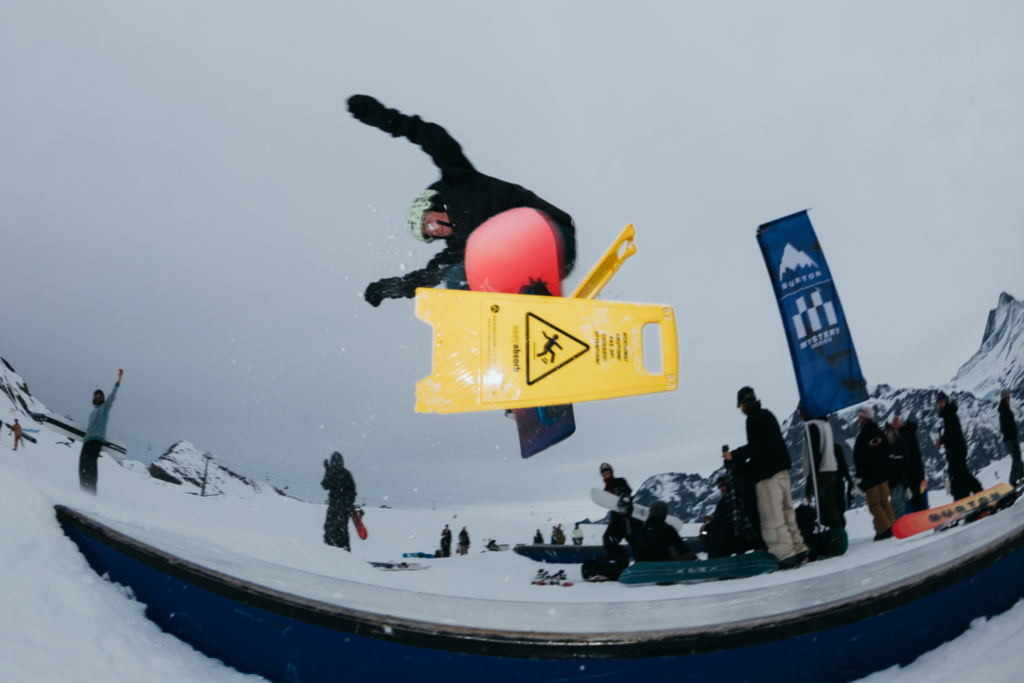We were asked to host the open session and try to incorporate our “super friendly playground”. This is a concept that we started two seasons ago to have an inclusive, creative and playful park where all skill levels can try tricks and be a part of it. It’s always been important for us to create a space that’s less intimidating to approach – which is what we’re trying to achieve with the playground. For this session in Grindelwald, we only brought a few elements, but it was still really fun!