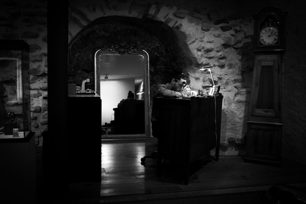 Sometimes he spends days, or even weeks on a single face, solving problems and restoring details; at times, reengineering the tiny parts needed to get these time pieces ticking again. It’s a real contrast from the snowboarder that I know — a skate influenced rider, attracted to decaying places, full of crumbling concrete and rusted steel. Sure, he looks different, here at his day job, but he’s still very much the same guy; focused and meticulous, with an eye for detail.